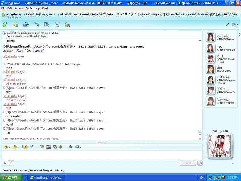 Tadaima~ Hehehe, akb48! Akb48ÂșTomomi is now my nick in dota games :D. Along side with quite a few other friends of mine, we often team together and kick ass with our akb nicks. All u have to do is to pick your favourite gal out of 48 of them and u r in! I shall show u a screenshot of Nigel's view while chatting with us, the "akbs" LOL. Click on the link below to view. http://i112.photobucket.com/albums/n192/DreamChazer_KOK/akb.jpg Speechless right? lol. Our display pics from his view is certainly ownage. Currently we haf 10 in the team already, aim is 48! I still think that my pick is better than all the others =/. I remember it was during the holiday when we started using such nicks. We still typed, "Aitakatta aitakatta aitakatta YES!!" in the games as some sort of cheer. After that, i was curious wat does aitakatta means... Regretted finding out though. Aitakatta = I wanted to see you. That simply meant that we are saying. "I wanted to see you, i wanted to see you, i wanted to see you, YES!" all these while in games lol. Nobody knows anyways =/. That song is catchy what... cant blame us. Currently waiting for Sans to do up my blog header pic. The "tomo-chin dun cry" pic doesn't fit in my theme man but i cant find any pics of her that fits in, therefore must wait for him. I sux at photoshop, i tried making 1 myself but it absolutely sux... Time to wait... Tomorrow short day, 10am to 12pm, 2 hours of lecture n home! Nice. Alright. Konbawa!